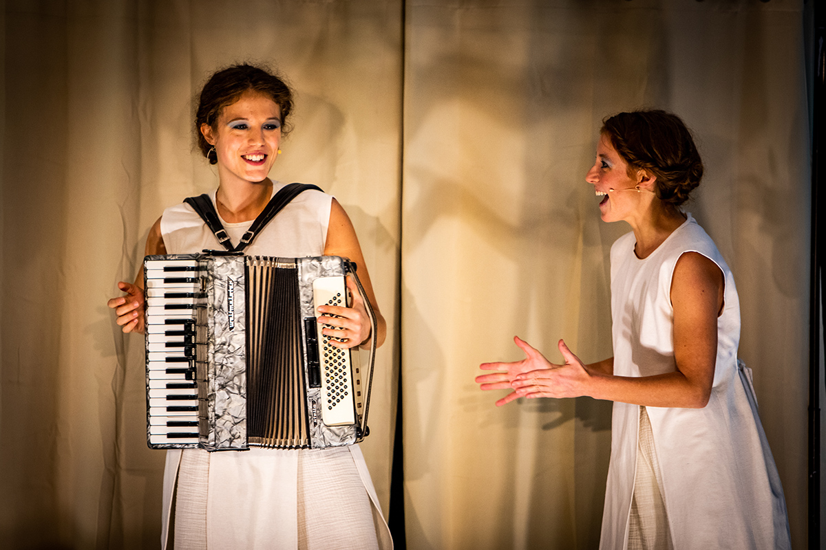 Elena è la donna che tutti conoscono come la causa della lunga guerra di Troia, ma Euripide mette in scena la seconda versione del mito: Elena non è mai stata a Troia. Grazie a cambi di registro, improvvisazione, aperture a pubblico e musica dal vivo lo spettacolo prende vita in maniera insolita portando lo spettatore a indagare il tema della guerra. In un gioco di specchi, illusioni e riflessi le due moderne cantastorie narrano una vicenda che mette in luce quanto alle volte si è convinti di lottare e combattere per una ragione che poi alla fine, a ben guardare, non esiste nemmeno. La musica accompagna lo spettacolo e funge da vero e proprio elemento drammaturgico dando maggior risalto ai momenti di phatos e dramma e diventando una vera e propria colonna sonora cucita su misura sulla rappresentazione.